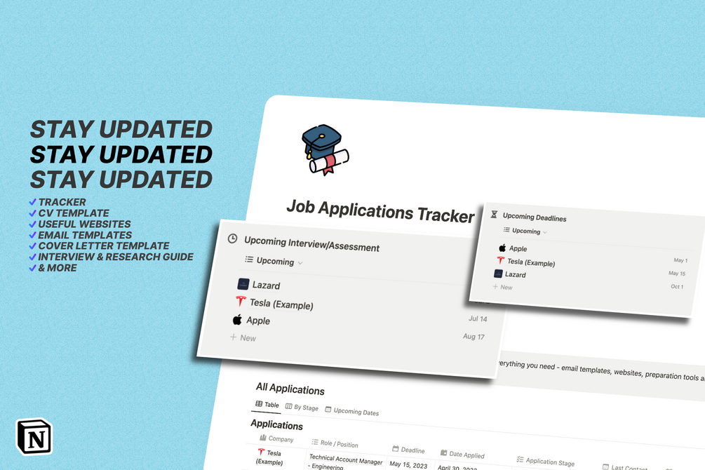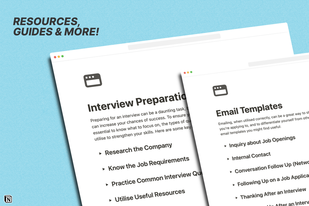 With this Notion template you can stay up to date on all the applications to jobs you have made. Easily perfect your application with tools and resources to help you stand out.